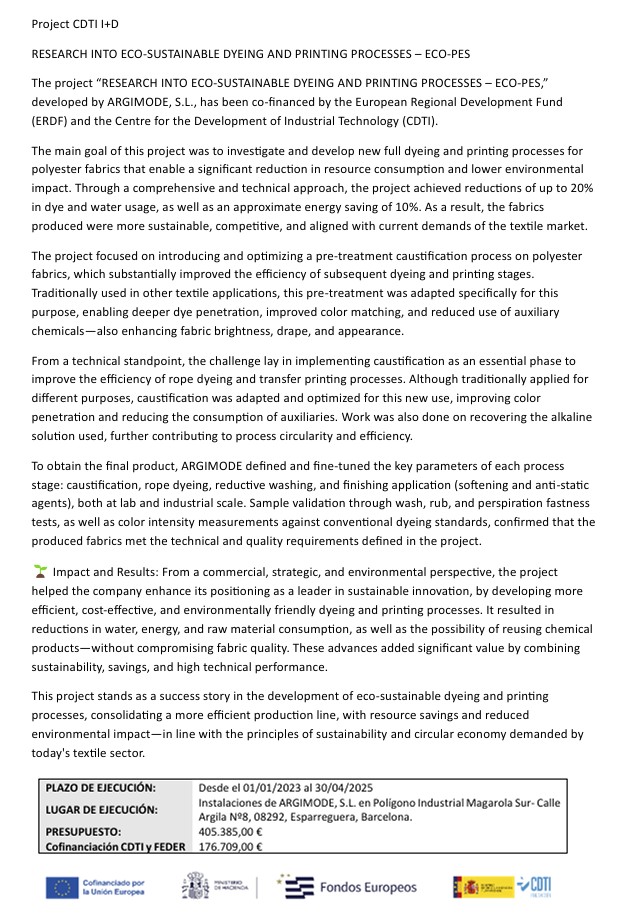 Argimode, sl is an industrial dry cleaner, where we dye, finish and ennoble all kinds of fabrics made with the most diverse fibers and their blends, from the classic ones such as polyester, polyamides, cottons and viscose, to the most innovative ones oriented to the fashion sector , labor sector and others.